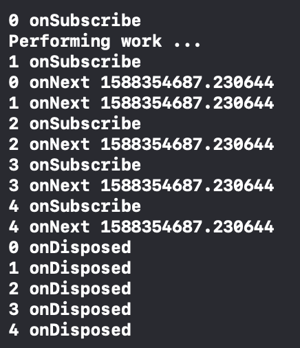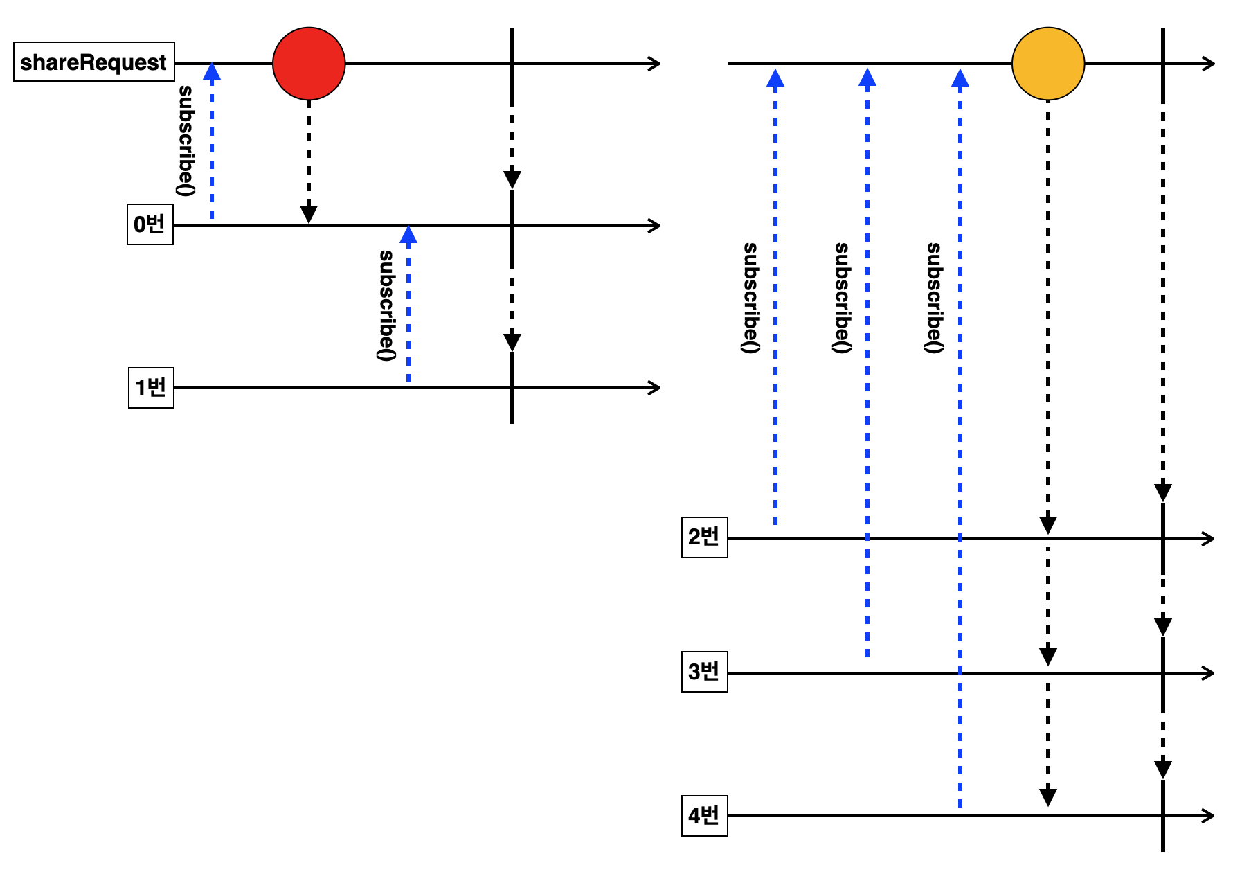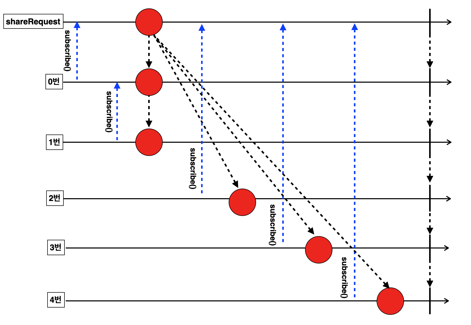 이런 비동기적인 특성으로 인해 0번이 complete - dispose 되는 시점과 1번이 구독하는 시점을 동기화 할 수 없으며, 타이밍적으로 겹칠 수 있습니다. 그럴 경우 share()의 기본 replay 카운트는 0이므로 이벤트를 수신하지 못하고, 대기하다가 종료하게 됩니다.